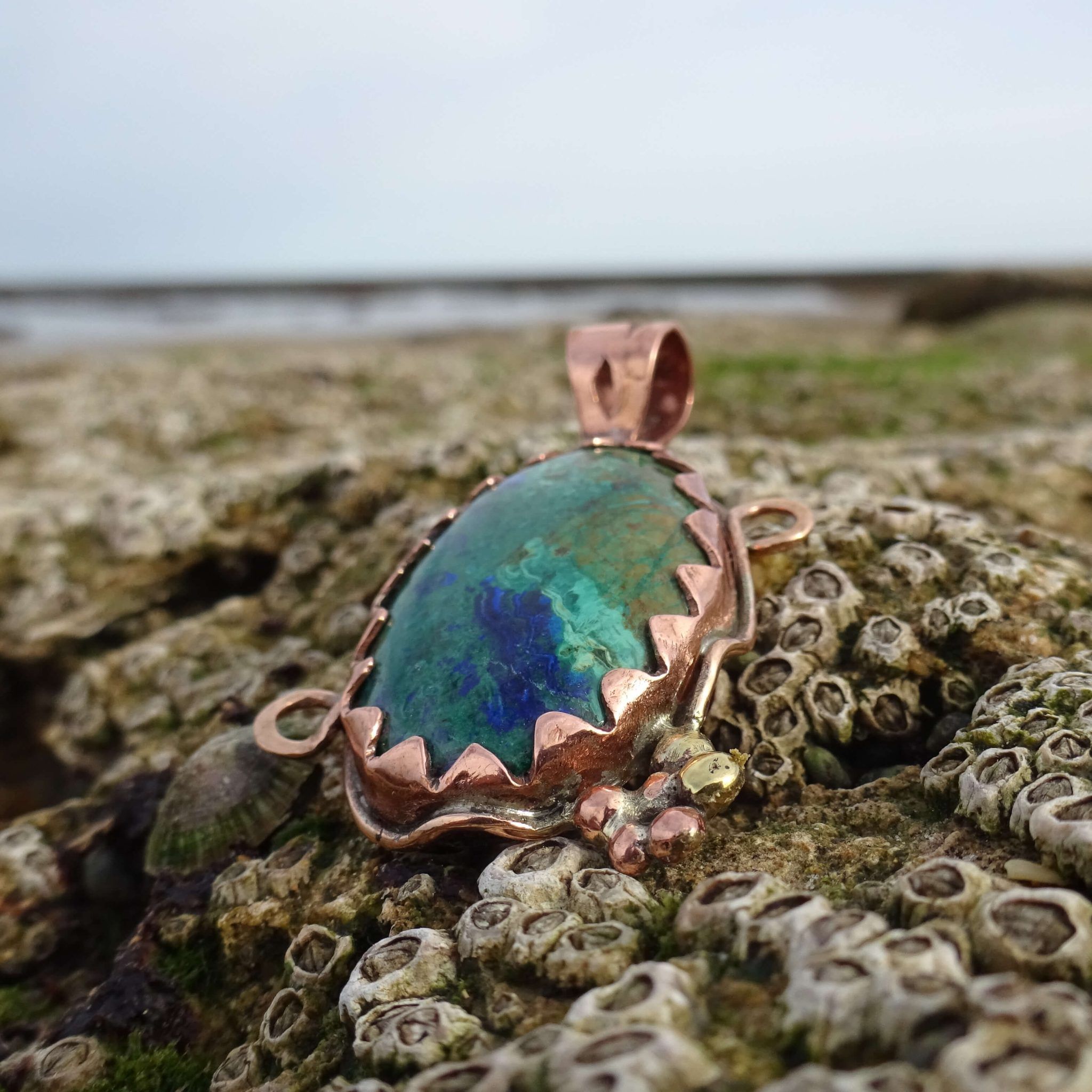 - Colgante creado con cobre diseñado para encajar la piedra respetando su forma y evitando cubrirla de manera excesiva con el metal, así se mantendrá en contacto con tu piel en todo momento.